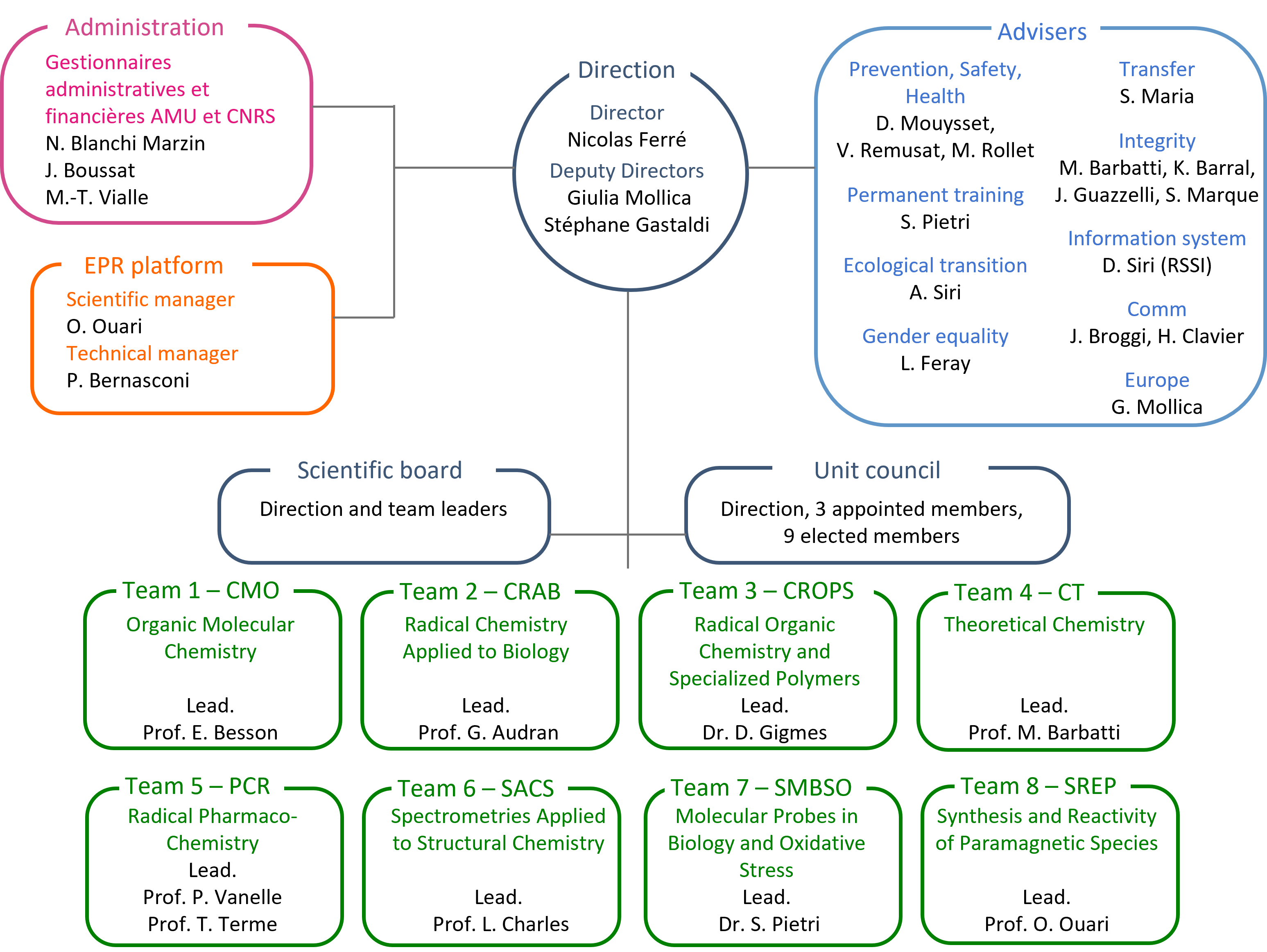 The ICR is organized into 8 teams whose research activities encompass several interfaces between radical chemistry, organic synthesis, simulations, materials or even biology. Seven teams (CMO, CRAB, CROPS, CT, SACS, SMBSO, SREP) are located on the Saint-Jérôme campus, Av. Esc. Normandie Niemen, 13397 Marseille Cedex 20; the PCR and SMBSO teams are located in the premises of the Faculty of Pharmacy of Marseille, 27 Bd Jean Moulin, 13385 MARSEILLE Cedex 05.
